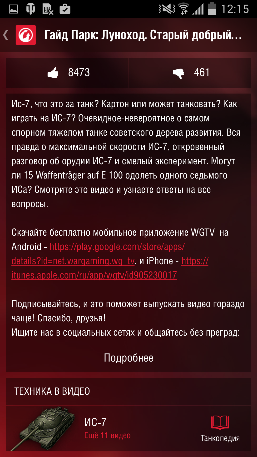 Но и это ещё не всё! Теперь из WGTV, конечно же, можно перейти в WoT Assistant всего в одно касание, просто нажав на кнопку «Танковедение» напротив интересующего вас танка в секции «Техника в этом видео». Детально изучить тактико-технические характеристики танка, сравнить с другим или посмотреть, кто из друзей на нём играет, стало ещё проще!