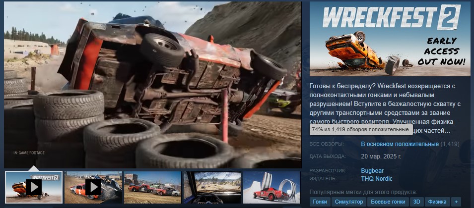 Несколько дней назад Bugbear Studio и THQ Nordic выпустили в Steam Early Access «духовного наследника» культовой FlatOut - Wreckfest 2. При этом в разработке новой игры принимали участие разработчики, в свое время создававшие знаменитую гонку. На данный момент Wreckfest 2 получила 74 % положительных отзывов в Steam.