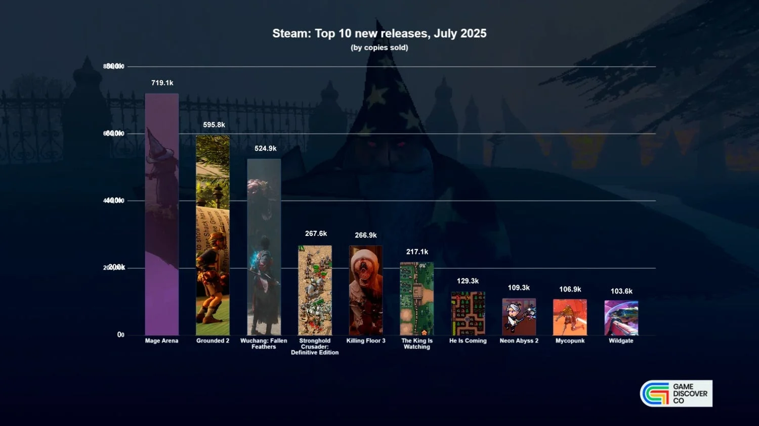 Также агентство выложило статистику по июльским новинкам с наибольшим количеством купленных копий. Здесь представлено много игр в раннем доступе, главная из которых — многопользовательский PvP-арена-шутер Mage Arena.